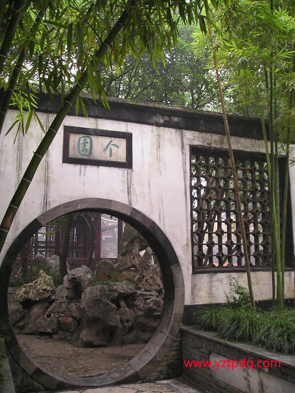 個(gè)園是一處典型的私家住宅園林。從住宅進(jìn)入園林,首先映入眼簾的是月洞形園門。門上石額書寫“個(gè)園”二字,“個(gè)”者,竹葉之形,主人名“至筠”,“筠”亦借指竹,以為名“個(gè)園”,點(diǎn)明主題。園門兩側(cè)各種竹子枝葉扶疏,“月映竹成千個(gè)字”,與門額相輝映;白果峰穿插其間,如一根根茁壯的春筍。主人以春景作為游園的開篇,想是有“一年之計(jì)在于春”的含意吧!透過春景后的園門和兩旁典雅的一排漏窗,又可瞥見園內(nèi)景色,樓臺(tái)、花樹映現(xiàn)其間,引人入勝。進(jìn)入園門向西拐,是與春景相接的一大片竹林。竹林茂密、幽深,呈現(xiàn)生機(jī)勃勃的春天景象。