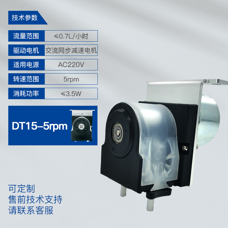 適用泵頭DT15,適用軟管Pharmd19# 、16# 、25# ,最大參考流量≤15(ml/min),通道數1