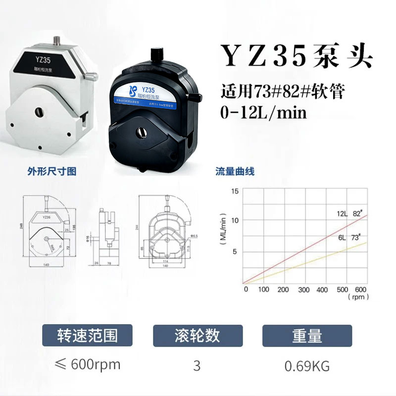 YZ35泵頭,適用73#82#軟管,單通道最大流量12000mL/min。