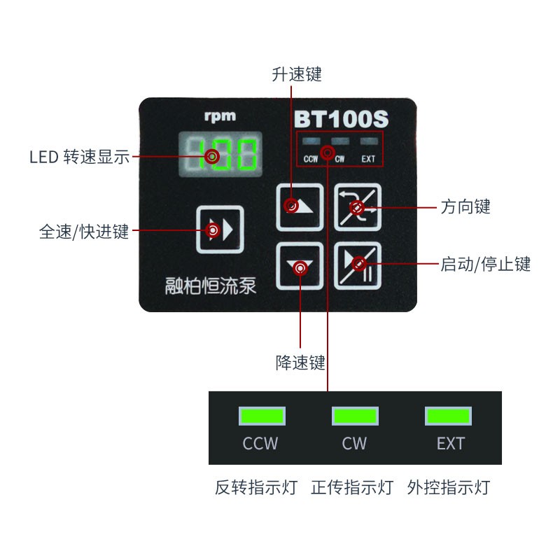 ▲實體按鍵調(diào)節(jié)轉(zhuǎn)速、方向、啟/停,操作簡單便捷;還設(shè)有全速鍵,可實現(xiàn)快速填充或排空
